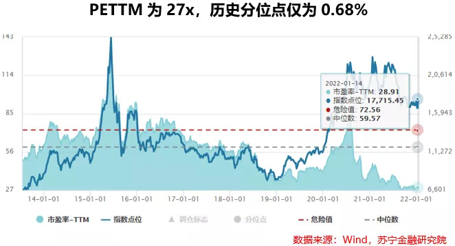 醫(yī)療器械因?yàn)榫哂邢M(fèi)與科技創(chuàng)新的雙重屬性,一直以來(lái)都被資本市場(chǎng)較為看好,估值也較高。如果從醫(yī)療器械指數(shù)發(fā)布的日期2013年7月算起,指數(shù)的長(zhǎng)期估值中位數(shù)為60x左右,當(dāng)前的PETTM為27x,歷史分位點(diǎn)僅為0.68%,看起來(lái)是一個(gè)絕對(duì)低估的區(qū)域。