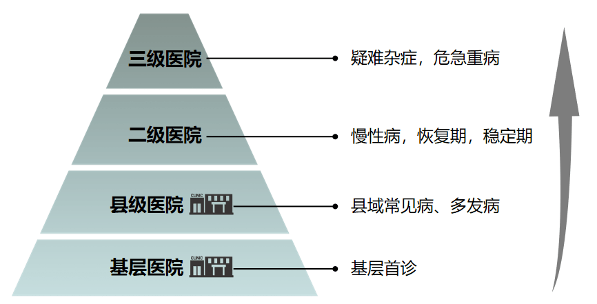 國家的分級診療制度已經(jīng)逐步落地,由基層醫(yī)院、縣級醫(yī)院、二級醫(yī)院和三級醫(yī)院構(gòu)成類似“金字塔”形狀的分級診療模式,首診和健康管理在基層醫(yī)院實現(xiàn),縣級醫(yī)院主要功能為縣域常見病、多發(fā)病的診療,二級醫(yī)院主要功能為慢性病的診治以及服務(wù)于病人的恢復期和穩(wěn)定期,三級大型醫(yī)院門診則專攻疑難雜癥。在分級診療制度下,患者合理就醫(yī),合理分配了醫(yī)療資源,但是三級醫(yī)院也必然會面臨門診患者減少并以疑難病患為主、住院患者減少并以危重患者為主、急診急救量上升的現(xiàn)實情況。
