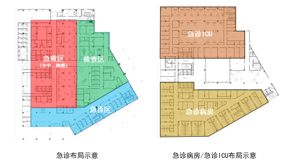 關(guān)于急診急救的完善主要是功能的進一步完善,使流程更加合理。上圖為河北醫(yī)大第一醫(yī)院建設(shè)布局圖,將腦卒中、胸痛和搶救區(qū)分為兩個區(qū),檢查區(qū)設(shè)置在后面,檢查區(qū)和急救區(qū)緊鄰急診區(qū)。在急診的上部設(shè)立了急診病房和急診ICU,整個建筑規(guī)劃設(shè)立的相對獨立的區(qū)域,急救可以在地下急診通道進入地下的停車場,即使門診關(guān)閉以后也能完成整個區(qū)域的急救任務(wù)。