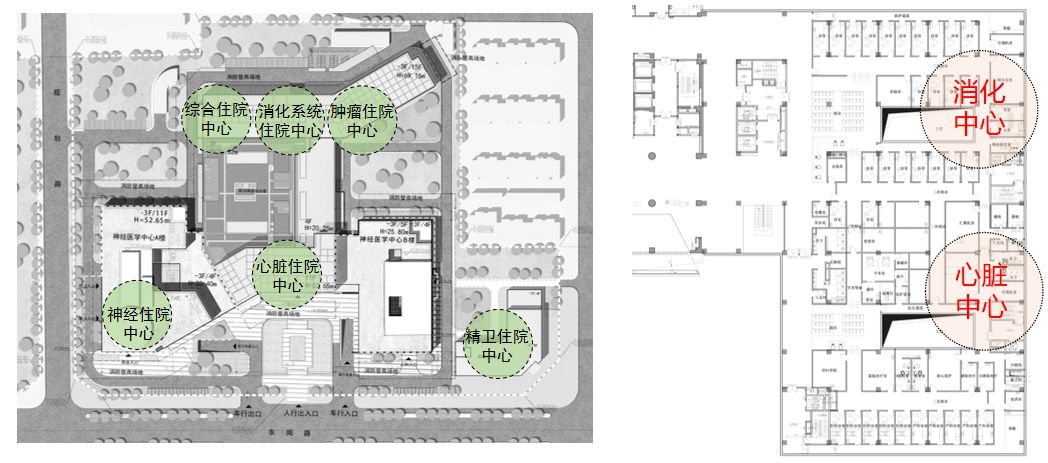 河北醫(yī)科大學第一醫(yī)院結(jié)合醫(yī)療中心與??菩枨笤O(shè)置了神經(jīng)住院中心、心臟住院中心、綜合住院中心、消化系統(tǒng)住院中心、腫瘤住院中心和精衛(wèi)住院中心,并充分考慮了平戰(zhàn)結(jié)合的理念。從??颇芰ㄔO(shè)方面,實行從器官和系統(tǒng)??频脑\斷模式,門診和病房均實現(xiàn)了一級平臺整合。將幾大中心通過中間平臺進行統(tǒng)一整合,一方面有利于設(shè)備實現(xiàn)公用,實現(xiàn)設(shè)備共用效率的最大發(fā)揮,另一方面更好的實現(xiàn)人員的調(diào)配,使醫(yī)生資源得到充分的效率提升。