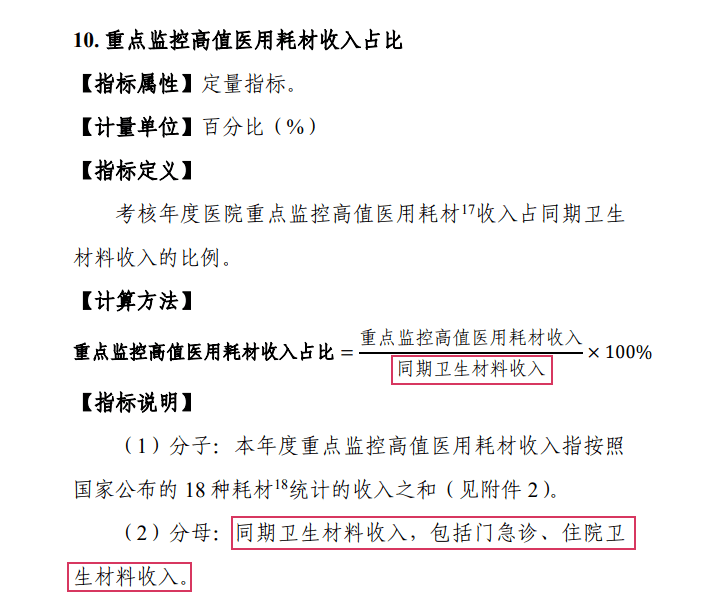 值得關(guān)注的是, 在今年4月國(guó)家衛(wèi)健委修訂并發(fā)布《國(guó)家三級(jí)公立醫(yī)院績(jī)效考核操作手冊(cè)(2022版)》時(shí),也新增了“重點(diǎn)監(jiān)控高值醫(yī)用耗材收入占比”這一指標(biāo),考核年度醫(yī)院重點(diǎn)監(jiān)控高值醫(yī)用耗材收入占同期耗材總收入比例。