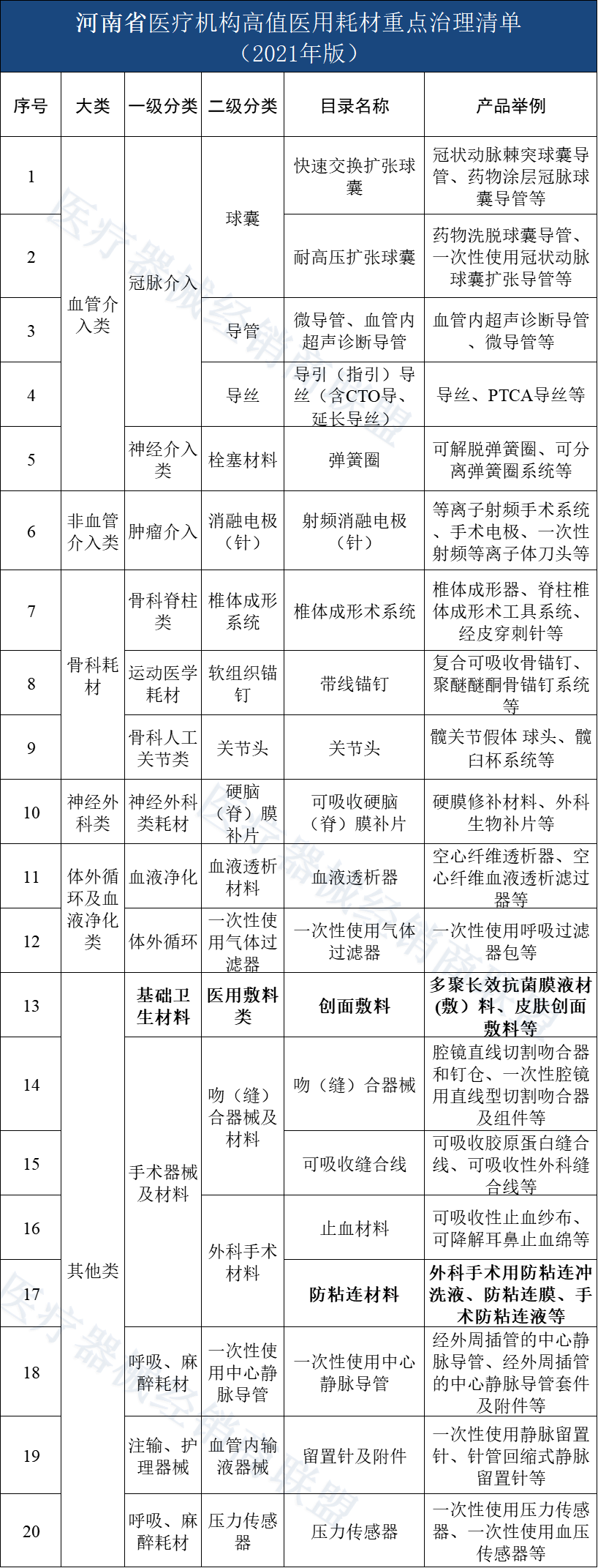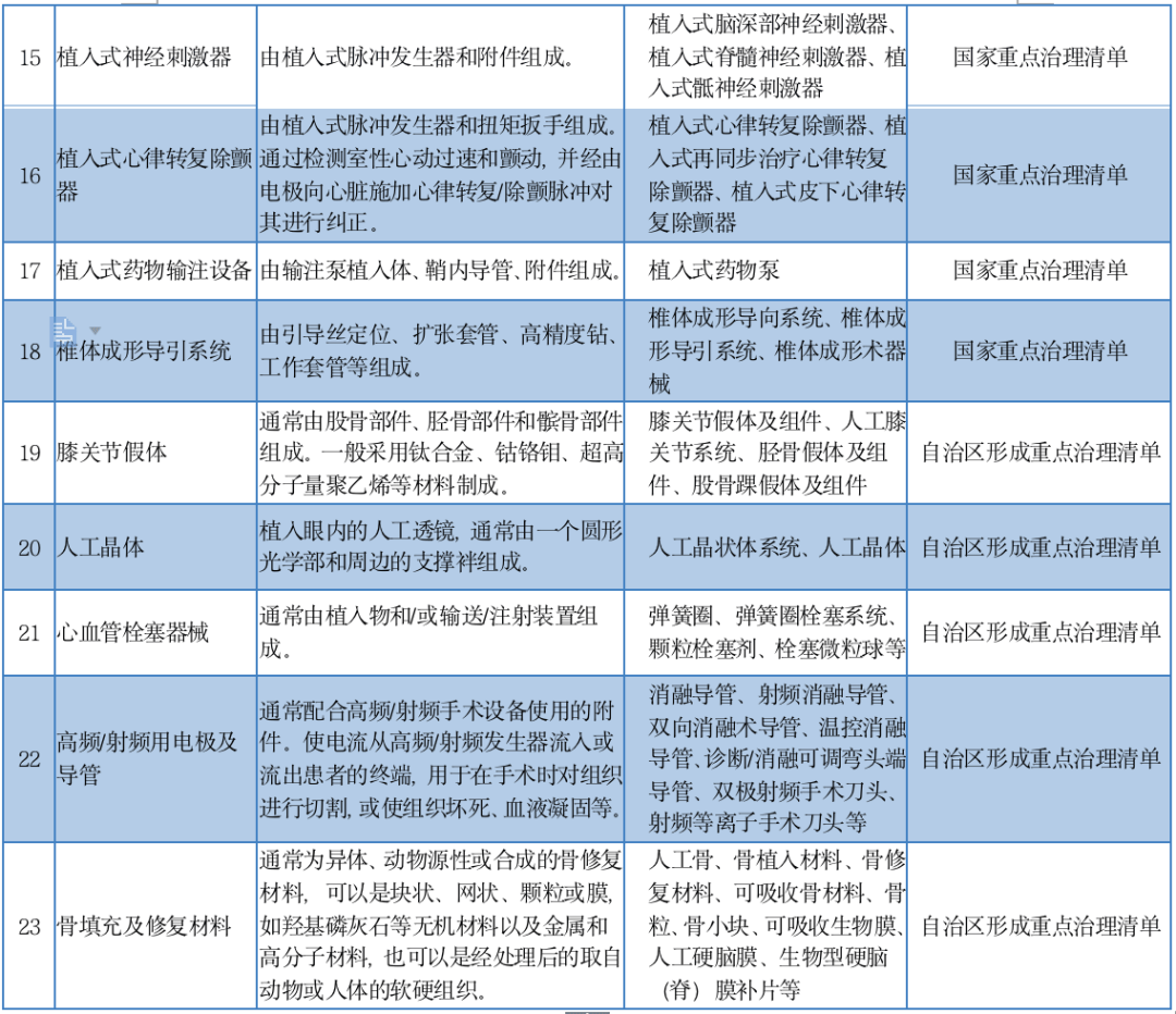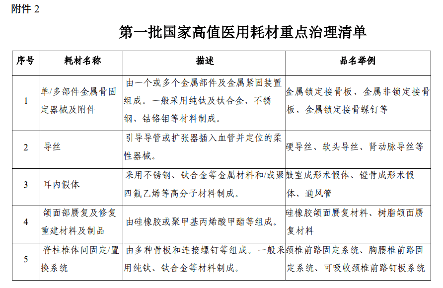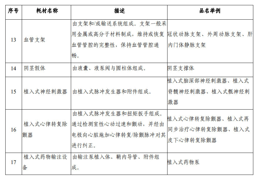 其中包括單/多部件金屬骨固定器械及附件、導(dǎo)絲、耳內(nèi)假體、頜面部贗復(fù)及修復(fù)重建材料及制品、脊柱椎體間固定/置換系統(tǒng)、可吸收外科止血材料、髖關(guān)節(jié)假體、顱骨矯形器械、刨骨器、球囊擴(kuò)張導(dǎo)管、托槽、吻合器(帶釘)、血管支架、陰莖假體、植入式神經(jīng)刺激器、植入式心律轉(zhuǎn)復(fù)除顫器、植入式藥物輸注設(shè)備、椎體成形導(dǎo)引系統(tǒng)這18類耗材。