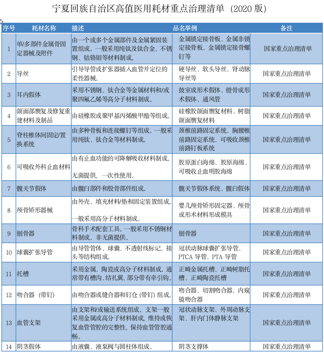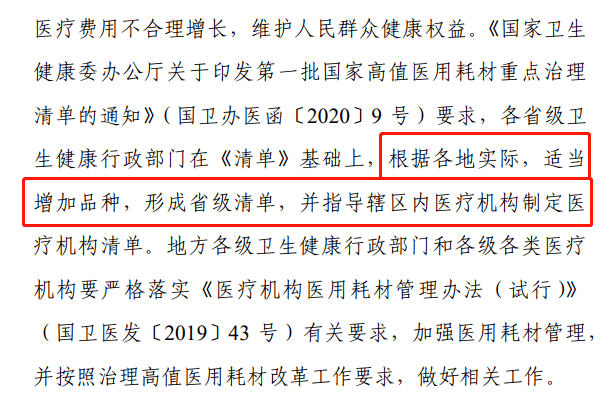 此前,寧夏回族自治區(qū)、河南省已經(jīng)根據(jù)實(shí)際情況,在國(guó)家清單的基礎(chǔ)上做出改變,增加了部分高值耗材品種。