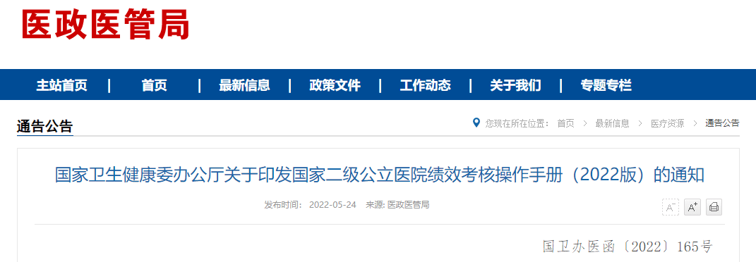 5月24日,國(guó)家衛(wèi)健委發(fā)布了《國(guó)家衛(wèi)生健康委辦公廳關(guān)于印發(fā)國(guó)家二級(jí)公立醫(yī)院績(jī)效考核操作手冊(cè)(2022版)的通知》(以下簡(jiǎn)稱通知)。