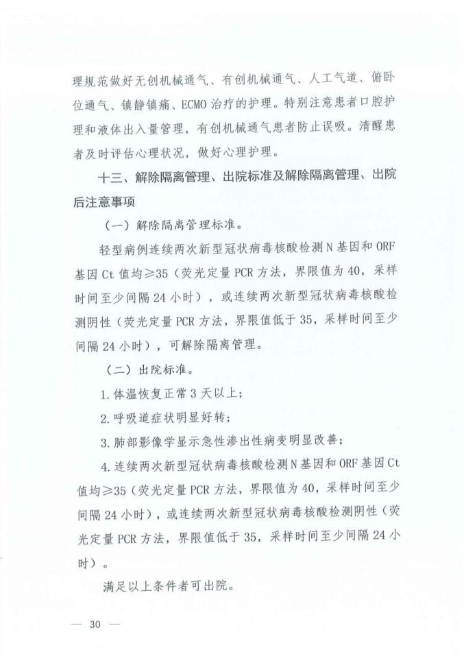 10、出院標(biāo)準(zhǔn)有較大更新:連續(xù)兩次新型冠狀病毒核酸檢測N基因和ORF基因Ct值均≥35(熒光定量PCR方法,界限值為40,采樣時間至少間隔24小時),或連續(xù)兩次新型冠狀病毒核酸檢測陰性(熒光定量PCR方法,界限值低于35,采樣時間至少間隔24小時)。