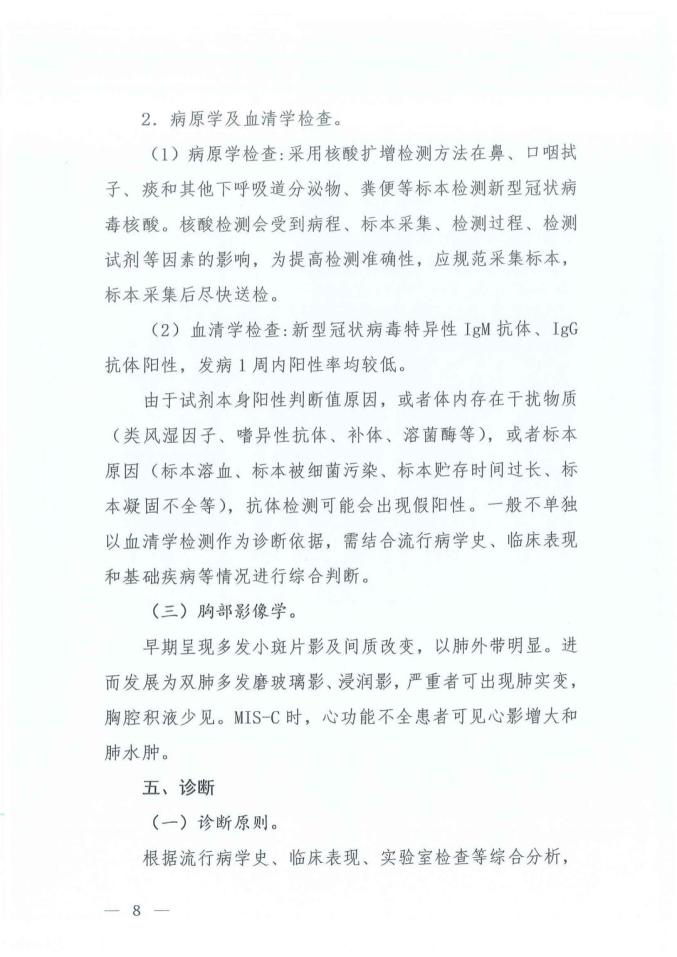 4、“診斷原則”提到:新型冠狀病毒核酸檢測陽性為確診的首要標(biāo)準(zhǔn)。未接種新型冠狀病毒疫苗者,新型冠狀病毒特異性抗體檢測可作為診斷的參考依據(jù)。接種新型冠狀病毒疫苗者和既往感染新型冠狀病毒者,原則上抗體不作為診斷依據(jù)。
