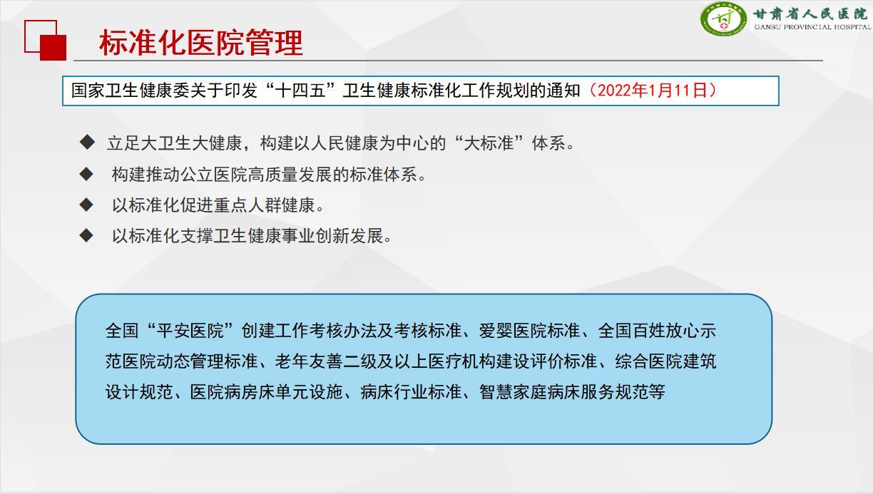 在醫(yī)院標(biāo)準(zhǔn)化建設(shè)方面,甘肅省人民醫(yī)院立足大衛(wèi)生大健康,構(gòu)建以人民健康為中心的“大標(biāo)準(zhǔn)”體系,納入全國(guó)“平安醫(yī)院”創(chuàng)建工作考核辦法及考核標(biāo)準(zhǔn)、愛嬰醫(yī)院標(biāo)準(zhǔn)、全國(guó)百姓放心示范醫(yī)院動(dòng)態(tài)管理標(biāo)準(zhǔn)等各級(jí)醫(yī)院考核標(biāo)準(zhǔn)。從標(biāo)準(zhǔn)化醫(yī)療、標(biāo)準(zhǔn)化環(huán)境、標(biāo)準(zhǔn)化宣傳、標(biāo)準(zhǔn)化服務(wù)以及信息化保障方面推進(jìn)標(biāo)準(zhǔn)化診區(qū)和病區(qū)建設(shè),以標(biāo)準(zhǔn)化診區(qū)和病區(qū)推進(jìn)智慧醫(yī)院建設(shè)。