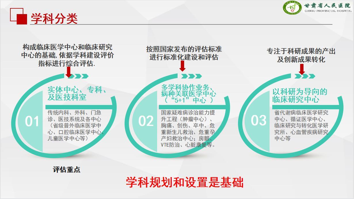 醫(yī)院學(xué)科的規(guī)劃和設(shè)置是所有學(xué)科發(fā)展的基礎(chǔ)。甘肅省人民醫(yī)院的學(xué)科設(shè)置與規(guī)劃分為三類,其一實(shí)體的中心、??萍搬t(yī)技科室;其二是多學(xué)科協(xié)作業(yè)務(wù)、病種關(guān)聯(lián)醫(yī)學(xué)中心(“5+1”中心 );其三是以科研為導(dǎo)向的臨床研究中心。
