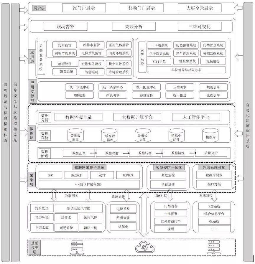 基礎設施層包括通用基礎設施和專用基礎設施,是智慧后勤平臺的基礎數(shù)據(jù)來源。通用基礎設施是為整個系統(tǒng)運行提供硬件性能支持及操作系統(tǒng)支持的通用基礎環(huán)境,包括服務器、網(wǎng)絡、存儲設備、路由器等硬件設備,以及操作系統(tǒng);專用基礎設施是為各專業(yè)子系統(tǒng)運行監(jiān)控提供軟硬件支持的專用基礎環(huán)境,包括樓宇自控DDC控制器(Direct Digital Control,直接數(shù)字控制)、能耗監(jiān)測智能水電表、電磁流量表、各類型環(huán)境傳感器、視頻監(jiān)控攝像機等硬件設備。