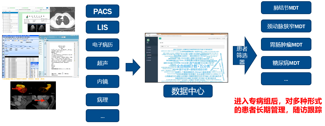 在數(shù)據(jù)中心建立智能化患者篩選器,通過檢查報告結(jié)構(gòu)化實現(xiàn)精準定位患者范圍,根據(jù)不同級別定義形成專病隊列。