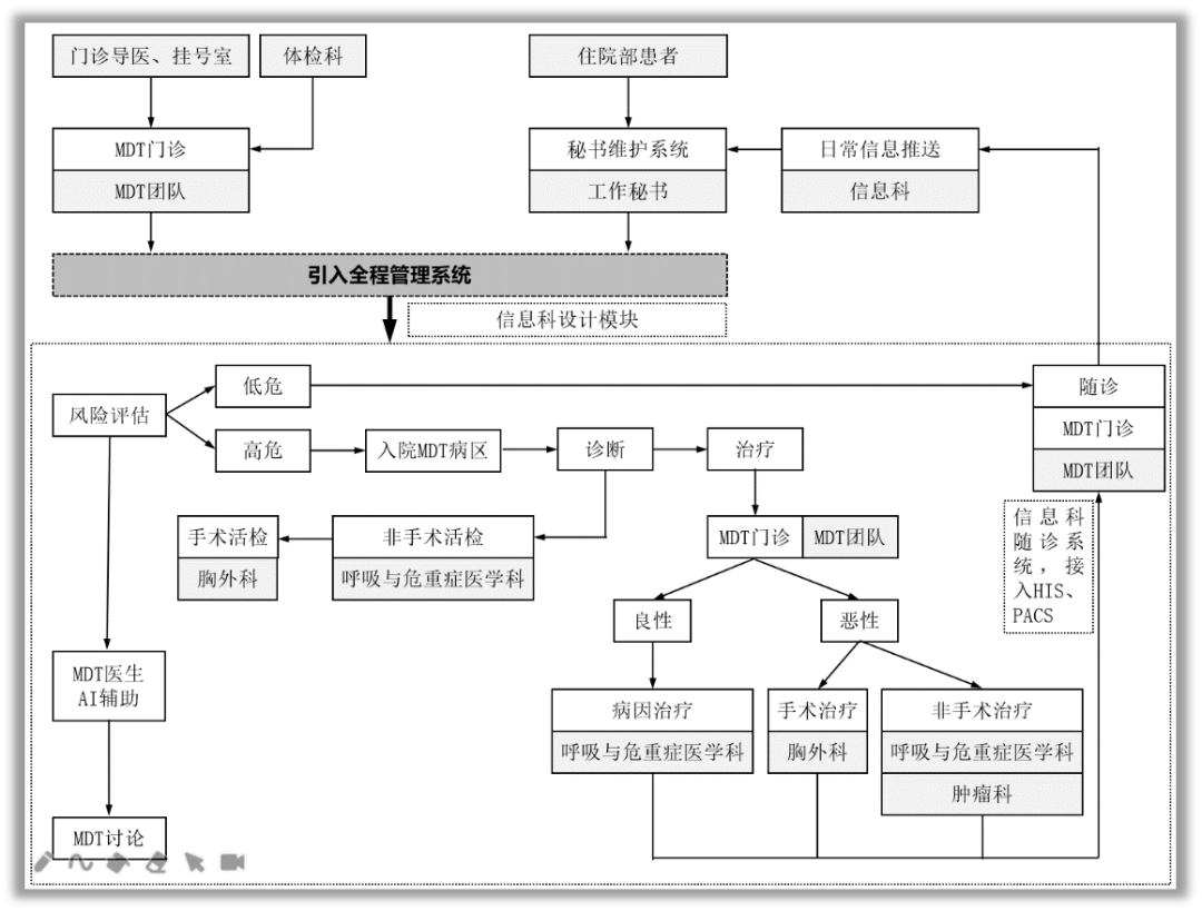 探索一種全病程管理模式,逐步推廣至多個病種。醫(yī)療服務轉(zhuǎn)被動為主動,信息化提供全面支撐,多學科聯(lián)合診療(下文稱MDT)給患者提供一站式醫(yī)療服務,省去多科室東奔西走的煩惱;針對病種,建立規(guī)范分組路徑,以患者為中心,全程診療數(shù)據(jù)展示及分析;提高患者參與度,讓患者參與診療計劃,知曉全病程;診后提供主動隨訪/復診/上門服務,全病程跟蹤診療。