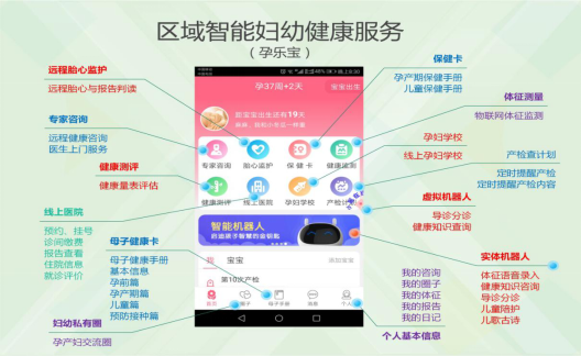 建成預約掛號、健康監(jiān)測、健康評估、線上問診、智能問診、機器人互聯(lián)、上門服務(wù)、孕婦學校、私有交流社區(qū)、三卡合一保健手冊等婦幼特色服務(wù),實現(xiàn)對婦幼人群健康信息進行收集、監(jiān)測與管理,滿足孕產(chǎn)婦不斷增長的醫(yī)療、保健、咨詢、宣教及陪護等功能