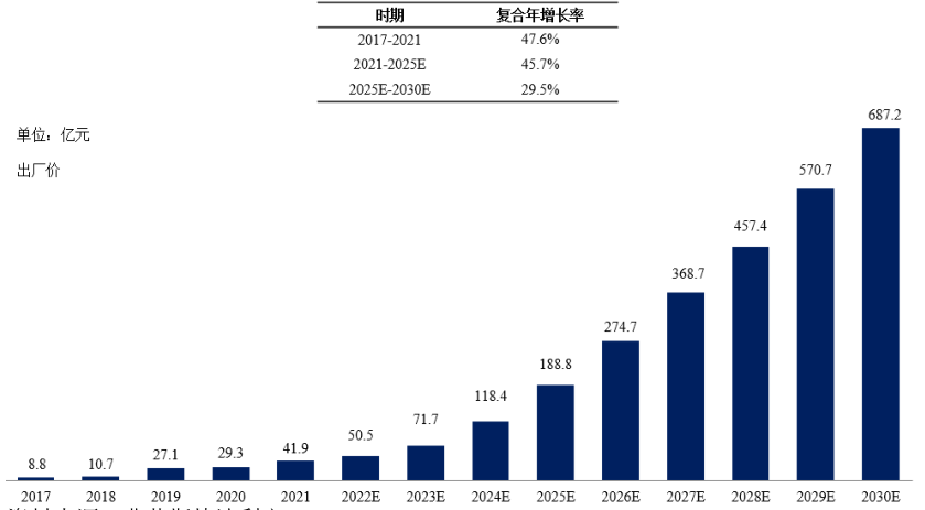 根據(jù)弗若斯特沙利文分析,2017—2021年,中國手術(shù)機(jī)器人市場(chǎng)由8.8億元增長(zhǎng)至近41.9億元,該期間的復(fù)合年增長(zhǎng)率為 47.6%。未來,隨著手術(shù)機(jī)器人輔助外科手術(shù)滲透率的提升,中國手術(shù)機(jī)器人市場(chǎng)將持續(xù)增長(zhǎng),預(yù)計(jì)2025年中國手術(shù)機(jī)器人市場(chǎng)將達(dá)到188.8億元,2021—2025年的復(fù)合年增長(zhǎng)率為45.7%。2030年,中國手術(shù)機(jī)器人市場(chǎng)將達(dá)687.2億元,2025—2030年的復(fù)合年增長(zhǎng)率為29.5%。