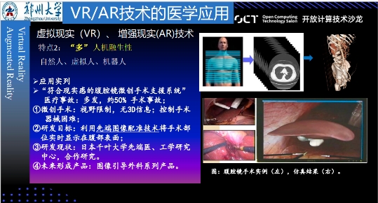 首先,VR、AR技術(shù)在醫(yī)療行業(yè),主要用來解決人機(jī)融生性問題。以腹腔鏡微創(chuàng)手術(shù)支援系統(tǒng)為例,我們知道膽結(jié)石手術(shù),傳統(tǒng)方式是在腹部開一個(gè)大窟窿,新型微創(chuàng)手術(shù)創(chuàng)口很小,但由于微創(chuàng)手術(shù)內(nèi)部信息看不見,需要用內(nèi)視鏡跟手術(shù)前CT拍攝的數(shù)據(jù)進(jìn)行配準(zhǔn),通過虛擬現(xiàn)實(shí)仿真來指導(dǎo)手術(shù)進(jìn)行。這里隱藏了什么呢?