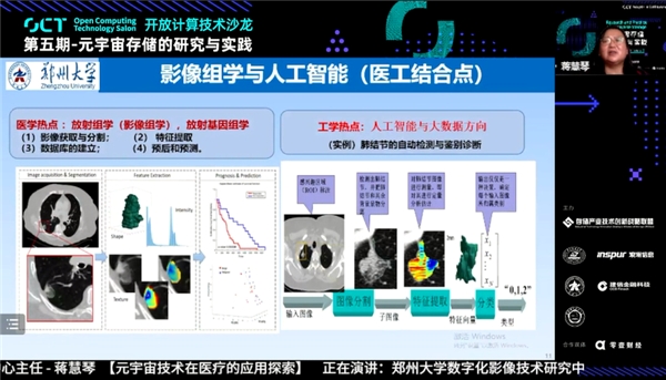 “我跟醫(yī)生接觸的比較多,醫(yī)生的研究熱點(diǎn)是放射組學(xué)、影像組學(xué)、放射基因組學(xué),這些研究都離不開多模態(tài)數(shù)據(jù)的支持”,蔣教授表示。以拍CT為例,拍CT是為了獲取影像,此后需要做的第一步就是特征提取,定位病灶在哪里并把這個(gè)病灶篩選出來進(jìn)行特征提取,然后觀察病灶的三維的特征、形狀,根據(jù)形狀的各種特征去判斷是結(jié)節(jié)或腫瘤是惡性的還是良性的,惡性度有多少,分期分級(jí),這就是醫(yī)學(xué)的一個(gè)過程。這個(gè)過程中,醫(yī)療人工智能需要跟數(shù)據(jù)存儲(chǔ)進(jìn)行緊密的結(jié)合。