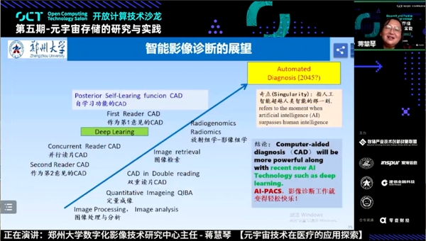 智能影像診斷領(lǐng)域,最初從圖像處理與分析開始,后來經(jīng)歷了定量成像、作為第2意見的計(jì)算機(jī)輔助診斷,然后從雙重圖片的開始,圖像檢索、深度學(xué)習(xí)技術(shù)出來后,開始出現(xiàn)作為第1意見的CAD,影像科開始討論機(jī)器是否會(huì)代替醫(yī)生、超越人類。蔣慧琴教授提出了醫(yī)療元宇宙的未來暢想,“未來我覺得人機(jī)融生是方向,下一代AI PACS會(huì)成為人機(jī)融生的新模式,在人體內(nèi)部元宇宙會(huì)在微觀的方向發(fā)展,在細(xì)胞級(jí)、DNA級(jí)展開研究,形成微觀層面的元宇宙數(shù)字世界”。