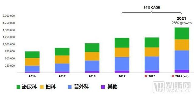 到了2009年,婦科成為手術(shù)量最大的領(lǐng)域,其中以機器人輔助子宮切除術(shù)為主,主要因手術(shù)機器人在病態(tài)肥胖、子宮過大、盆腔嚴(yán)重粘連等復(fù)雜病例子宮切除術(shù)中具備視野、仿真、震顫濾過、狹窄空間操作穩(wěn)定、視覺放大等優(yōu)勢,術(shù)后具備住院時間短的優(yōu)勢。目前美國每年仍有20萬~25萬例的手術(shù)需求。