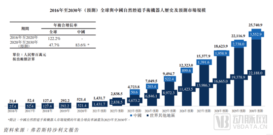 從商業(yè)化速度來看,支氣管鏡手術(shù)機(jī)器人在全球的裝機(jī)速度較快。根據(jù)弗若斯特沙利文的報(bào)告,經(jīng)自然腔道手術(shù)機(jī)器人全球市場規(guī)模近年持續(xù)快速增長,由2016年的人民幣2140萬元增至2020年的人民幣5.2億元,年復(fù)合增長率為122.2%,預(yù)期2030年將進(jìn)一步增至人民幣257.4億元,年復(fù)合增長率為47.7%。