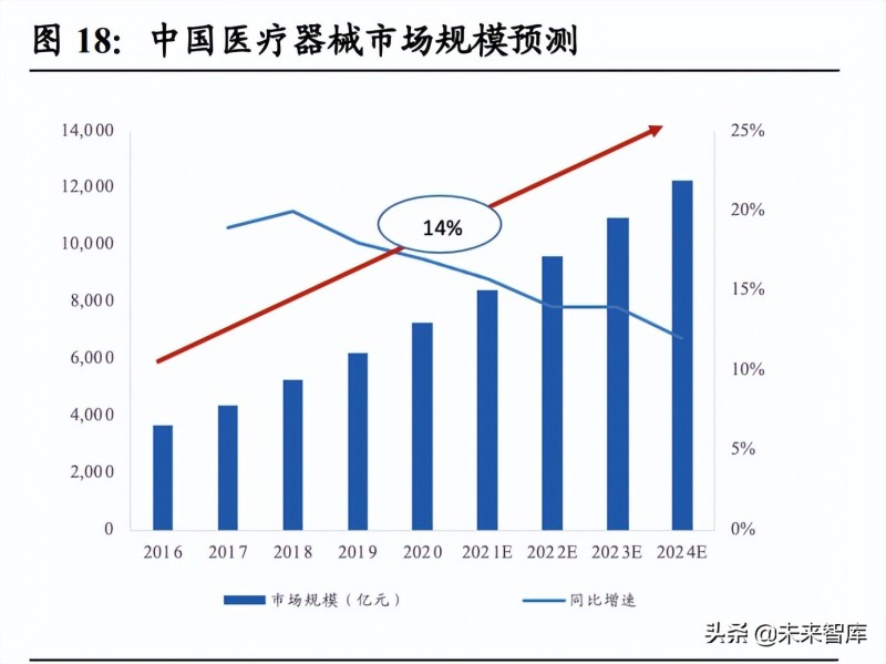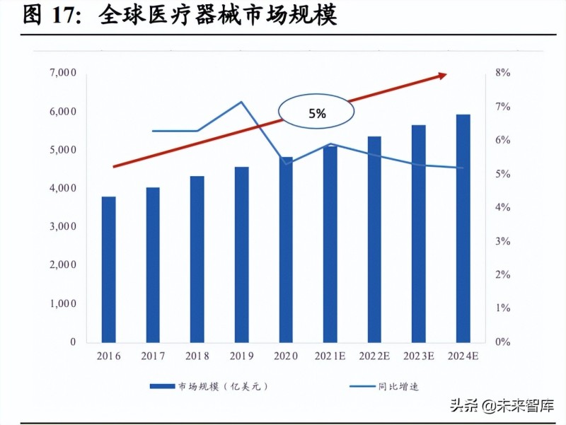 中國醫(yī)療器械市場空間大,復合增長率遠超全球水平。隨著經(jīng)濟的持續(xù)發(fā)展和相關 制度的完善,居民的生活水平不斷提高,醫(yī)療保健意識也逐漸增強,由此帶來醫(yī)療 器械產(chǎn)品需求的持續(xù)增長,醫(yī)療器械行業(yè)市場規(guī)模進一步擴大,再加上國家出臺的 支持性政策的影響,行業(yè)整體步入高速成長期,景氣度日益提升,在整個醫(yī)療行業(yè) 中的重要地位也越發(fā)凸顯。據(jù) Evaluate MedTech 發(fā)布的統(tǒng)計數(shù)據(jù),預計 2024 年全 球醫(yī)療器械銷售額將達到 5945 億美元,2020 年到 2024 年間復合增長率為 5%。2016 年到 2020 年,中國醫(yī)療器械市場規(guī)模從 3700 億元增長至 7295 億元,期間年復合 增長率為 14%,增速遠超全球市場同期水平。