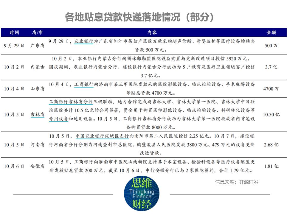 目前各省市積極響應(yīng)政策,已開始執(zhí)行使用財政貼息貸款更新改造醫(yī)療設(shè)備需求的調(diào)查工作,截至 9 月 30 日,僅浙江、江蘇、安徽等省已上報約 180 億元的設(shè)備采購需求。全國數(shù)千億級醫(yī)療設(shè)備更新改造需求即將釋放。十一國慶期間財政貼息貸款項(xiàng)目單位與銀行積極簽約對接保障工作,目前各地貼息貸款快速落地,截至 10 月 11 日公開數(shù)據(jù),各省市已落地貼息金額約 191.55 億元。