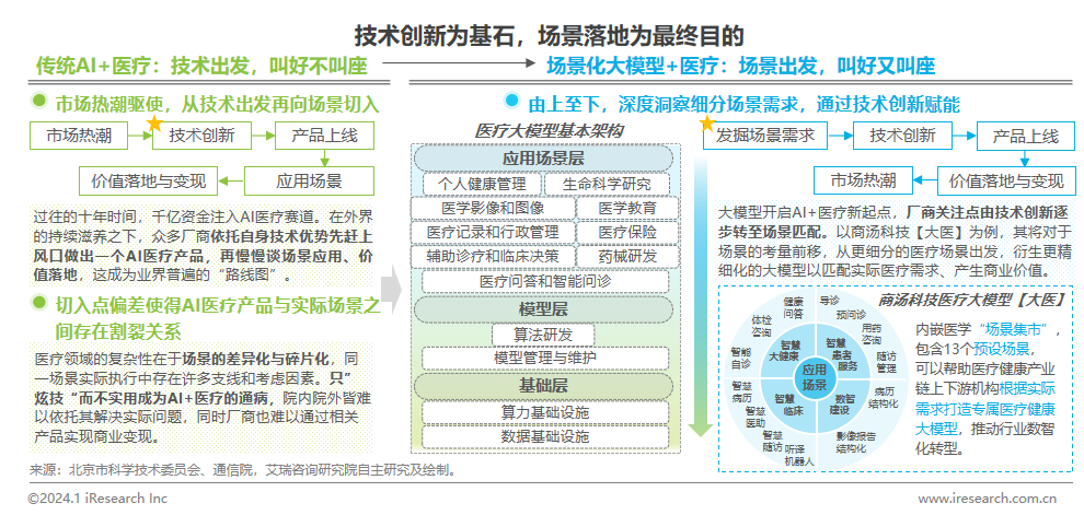 生命科學(xué)和醫(yī)療健康是AI技術(shù)最重要的應(yīng)用領(lǐng)域之一,據(jù)艾瑞測算,AI醫(yī)療市場規(guī)模已由2019年的約70億元增長至2023年的近300億元。在這過程中,科技廠商們紛紛追趕熱潮著手于AI醫(yī)療的推進(jìn)與商業(yè)化,如今回頭復(fù)盤,眾多廠商因急于趕上風(fēng)口而忽略了對于場景的洞察,導(dǎo)致了產(chǎn)品與場景的割裂。2023年,ChatGPT拉開了大語言模型產(chǎn)業(yè)蓬勃發(fā)展的序幕,這也是AI醫(yī)療的新起點(diǎn),越來越多的廠商開始嘗試以實(shí)際需求場景切入進(jìn)行后續(xù)大模型的研發(fā)與變現(xiàn),以此彌補(bǔ)產(chǎn)品與場景割裂的鴻溝。艾瑞認(rèn)為,這種由技術(shù)到場景的切入點(diǎn)的轉(zhuǎn)變有利于AI技術(shù)惠及各個(gè)復(fù)雜而碎片化的醫(yī)療場景,有利于轉(zhuǎn)變傳統(tǒng)AI+醫(yī)療“叫好不叫座”(即理論價(jià)值與市場熱潮很高,但實(shí)際應(yīng)用與變現(xiàn)困難重重)的商業(yè)難點(diǎn),能夠在價(jià)值落地與商業(yè)變現(xiàn)愈加受到市場關(guān)注的趨勢之下,助力整體【AI+醫(yī)療】產(chǎn)業(yè)商業(yè)模式閉環(huán)的落成。