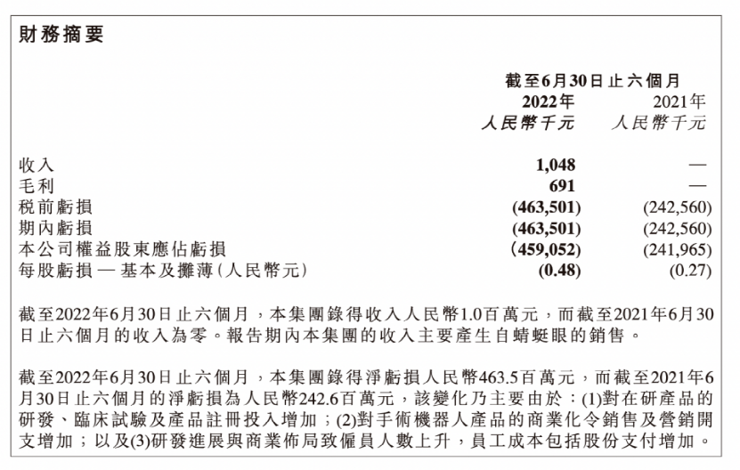 值得一提的是,微創(chuàng)機器人2022年上半年業(yè)績顯示,報告期內(nèi)實現(xiàn)營業(yè)收入104.8萬元,營收實現(xiàn)零突破;但上半年凈虧損4.64億元,去年同期凈虧損2.43億元。
