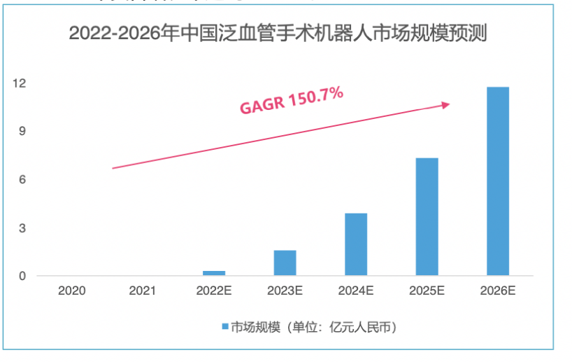 實際上,手術(shù)機器人市場方興未艾。根據(jù)弗若斯特沙利文的數(shù)據(jù),2020年全球血管手術(shù)機器人市場規(guī)模為0.31億美元,預(yù)計2026年將增長至16億美元,復(fù)合增速92.7%。而國內(nèi)血管手術(shù)機器人市場規(guī)模較小,處于起步階段,弗若斯特沙利文估計,我國泛血管手術(shù)機器人市場規(guī)模將從2022年的0.29億人民幣增長至2026年的11.34億人民幣,2022-2026年復(fù)合增長率達到150.7%。