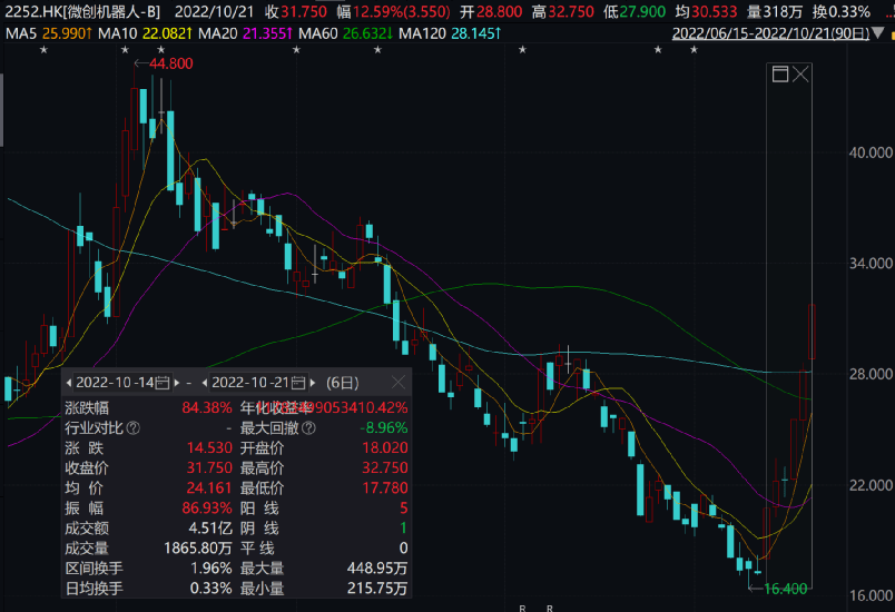 近期醫(yī)藥板塊有所回暖,微創(chuàng)機器人-B(2252.HK)21日延續(xù)漲勢,21日單日漲幅近13%,近6個交易日股價超過84%,接近翻倍。截至收盤,該股報價31.75港元/股,總市值為304億港元。
