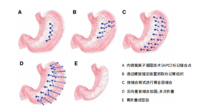 內(nèi)鏡下袖狀胃成形術(shù)(ESG)于2017年在美國正式通過審批并投入臨床工作。內(nèi)鏡下袖狀胃成形術(shù)(ESG)全程通過內(nèi)窺鏡進(jìn)行,通過反復(fù)的胃縫合收窄胃容量,區(qū)別于傳統(tǒng)的腹腔鏡縮胃手術(shù),ESG不需要在腹部開口,減少了手術(shù)傷口相關(guān)的并發(fā)癥并符合BMI較低的患者需求,手術(shù)在安全和效果上也得到了突破。