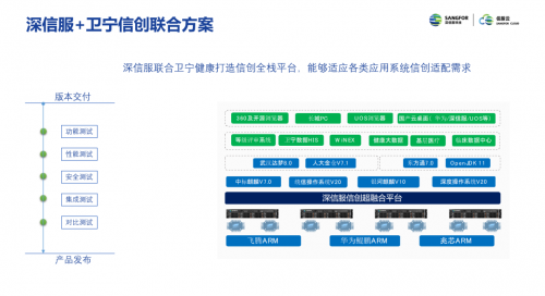 深信服聯(lián)合衛(wèi)寧健康通過(guò)聯(lián)合實(shí)驗(yàn)室的方式打造全棧平臺(tái),通過(guò)版本適配,能夠在最終產(chǎn)品發(fā)布上同步進(jìn)行,最大化地幫助醫(yī)院實(shí)現(xiàn)在信創(chuàng)領(lǐng)域里,通過(guò)軟件到最終平臺(tái),構(gòu)造全棧CPU架構(gòu),為醫(yī)院提供統(tǒng)一的信創(chuàng)的解決方案。
