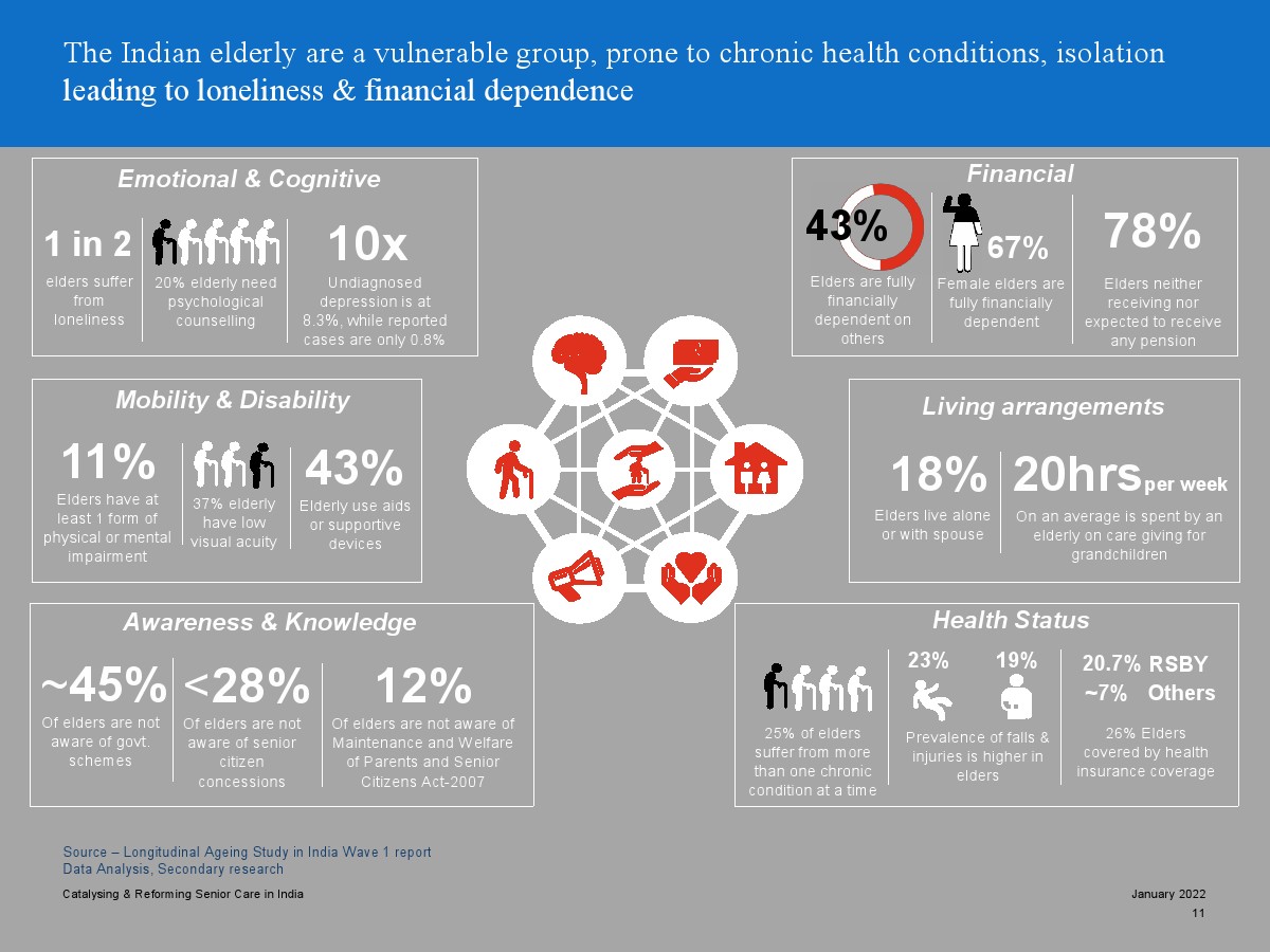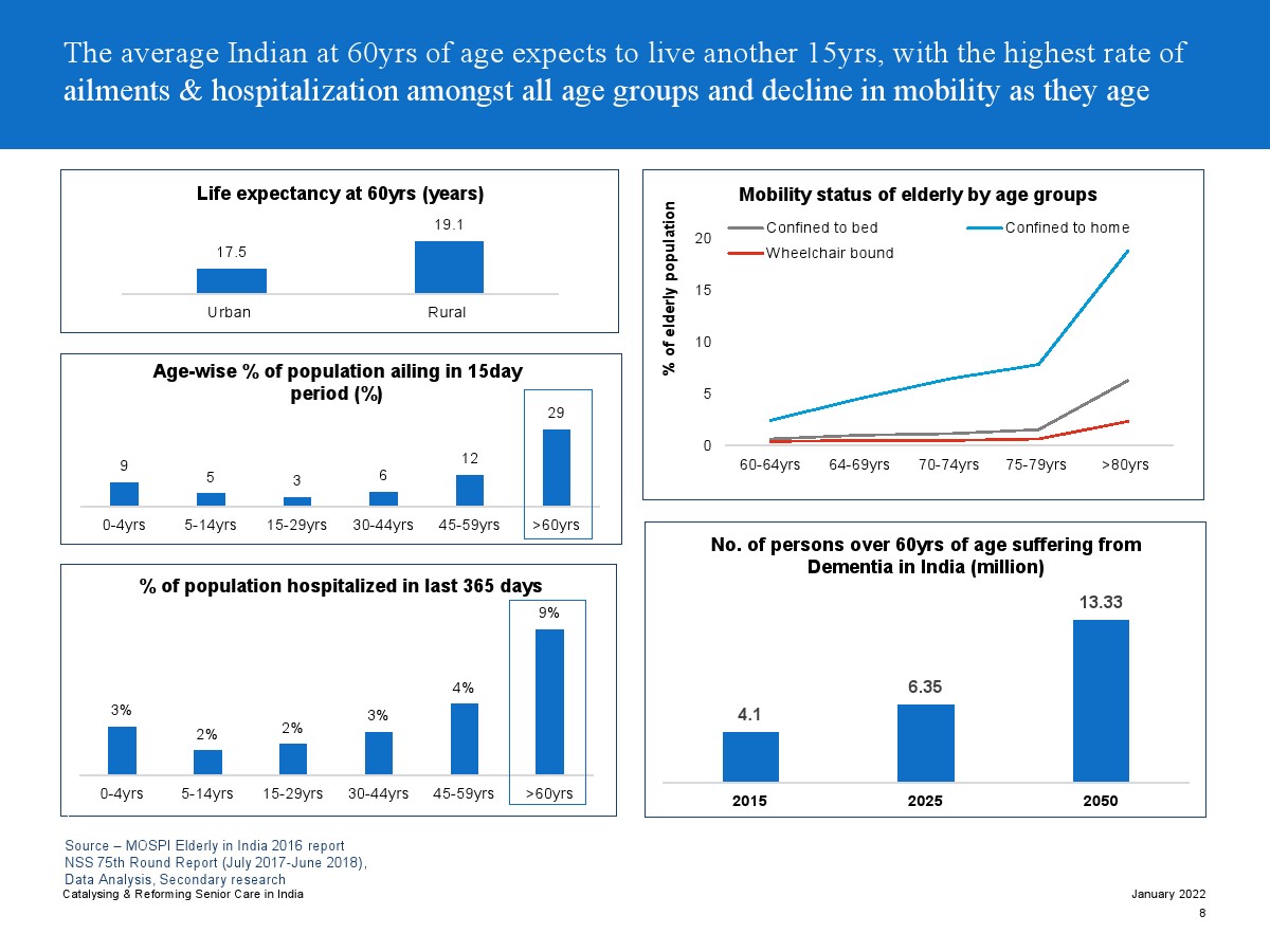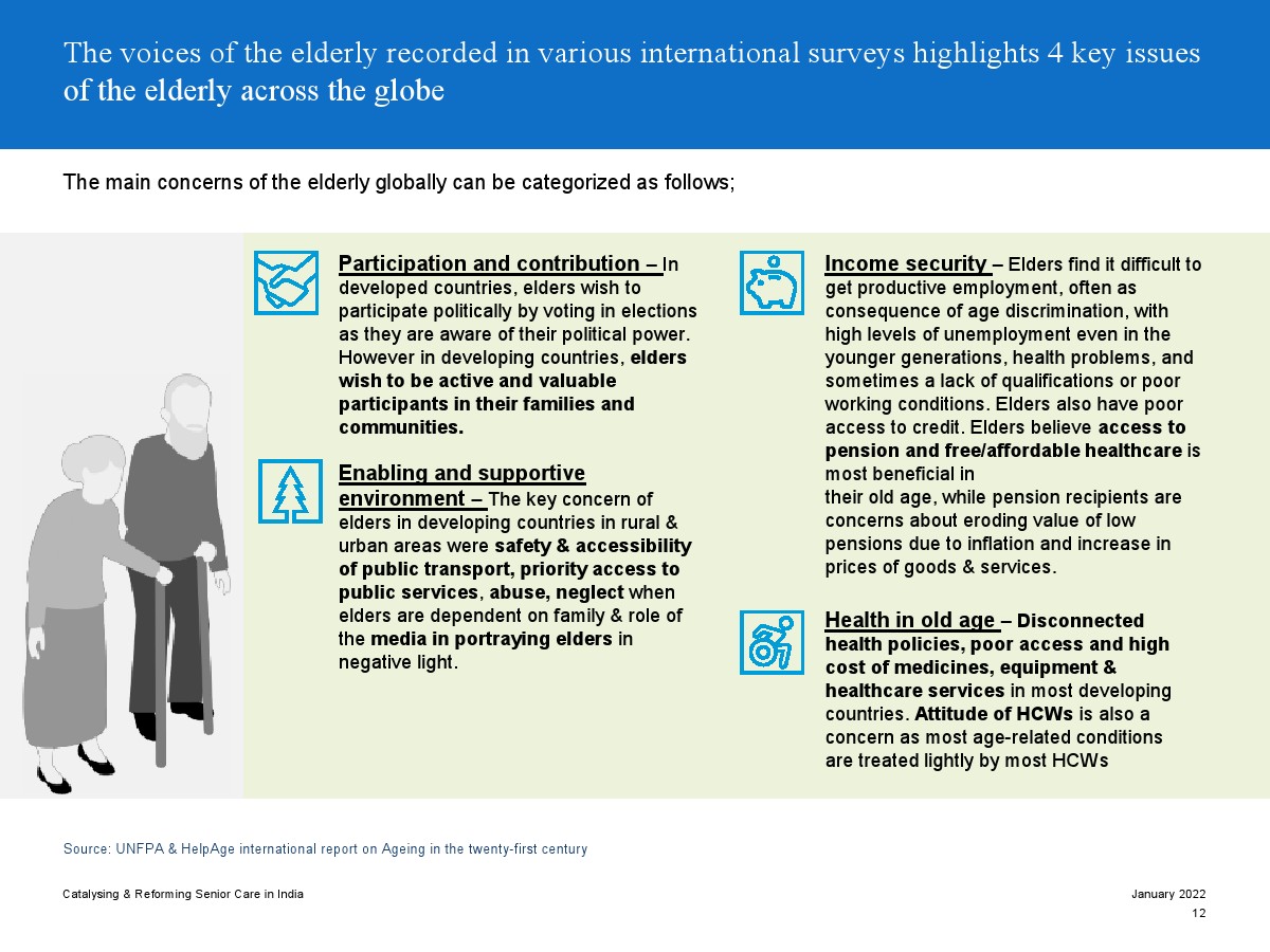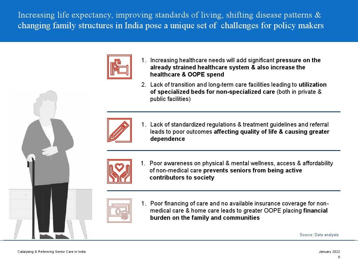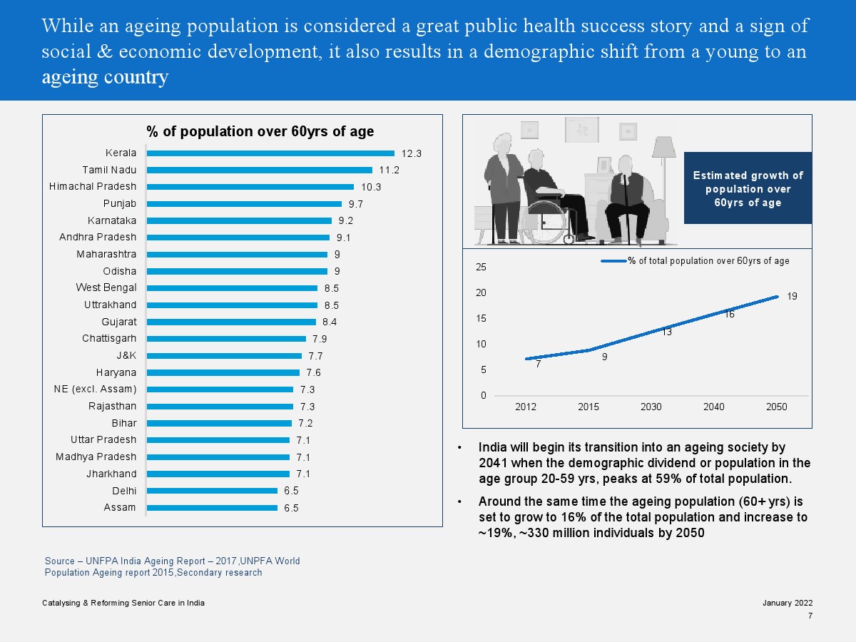 印度老年人協(xié)會發(fā)布了新報告“促進和改革印度老年人護理”。目前,印度享有年輕人口紅利。但到2050年,老齡化人口將增長到約3.3億人。老年人口的增長、預期壽命的延長、負擔能力的提高、疾病負擔的轉(zhuǎn)移和家庭結(jié)構(gòu)的變化正在推動對醫(yī)療和非醫(yī)療老年護理的需求。隨著人口老齡化的加劇,對護理和資源的需求將會增加。由于老年人將在未來30年內(nèi)占該國人口的20%,因此印度必須立即采取行動。