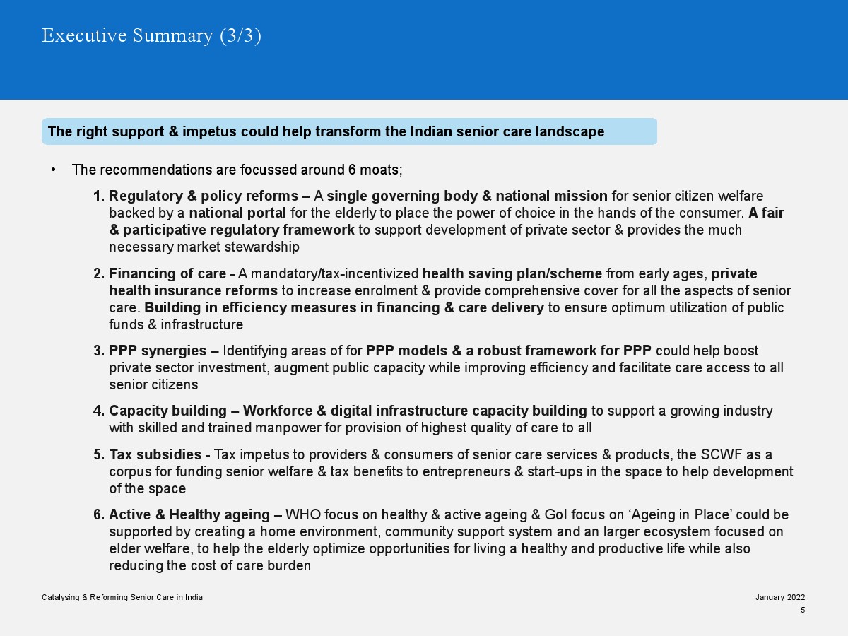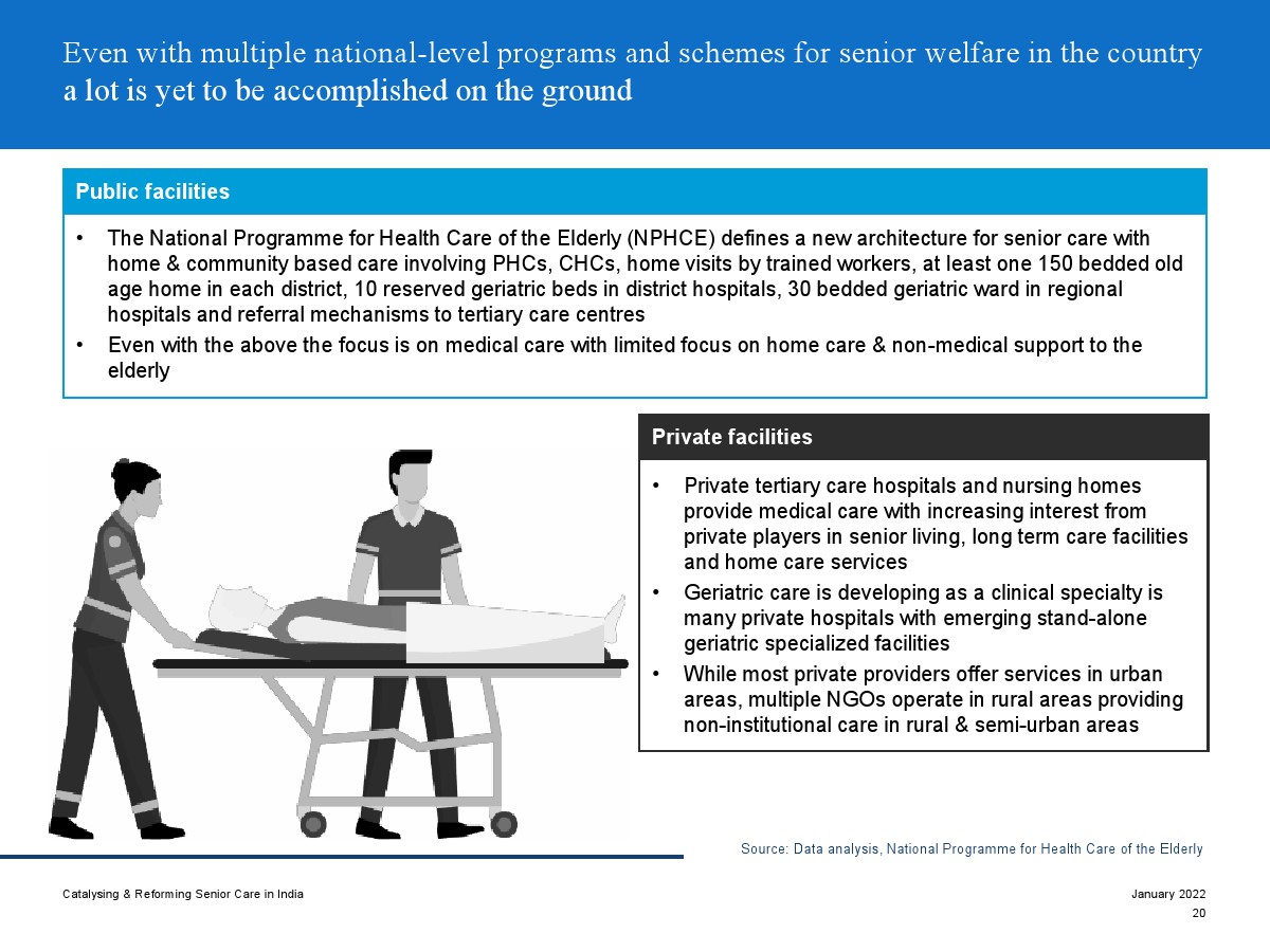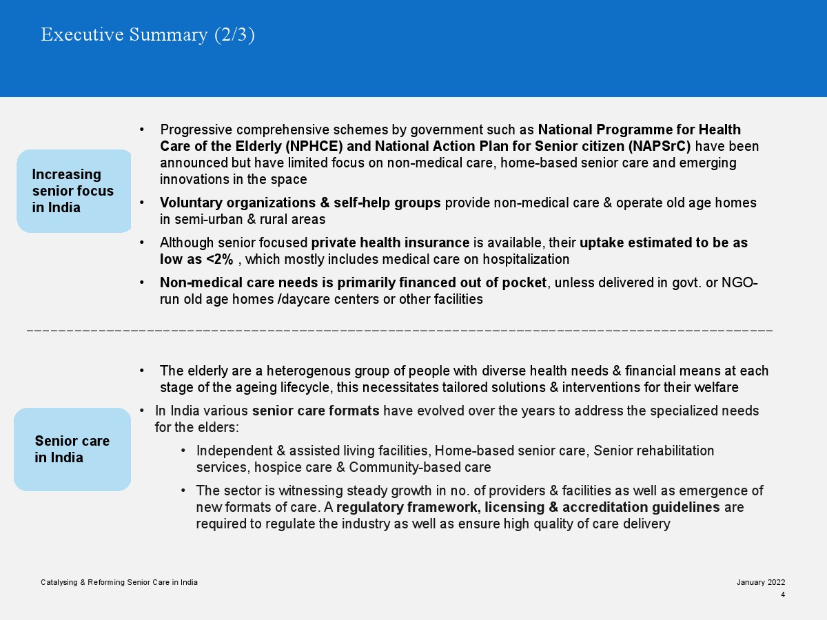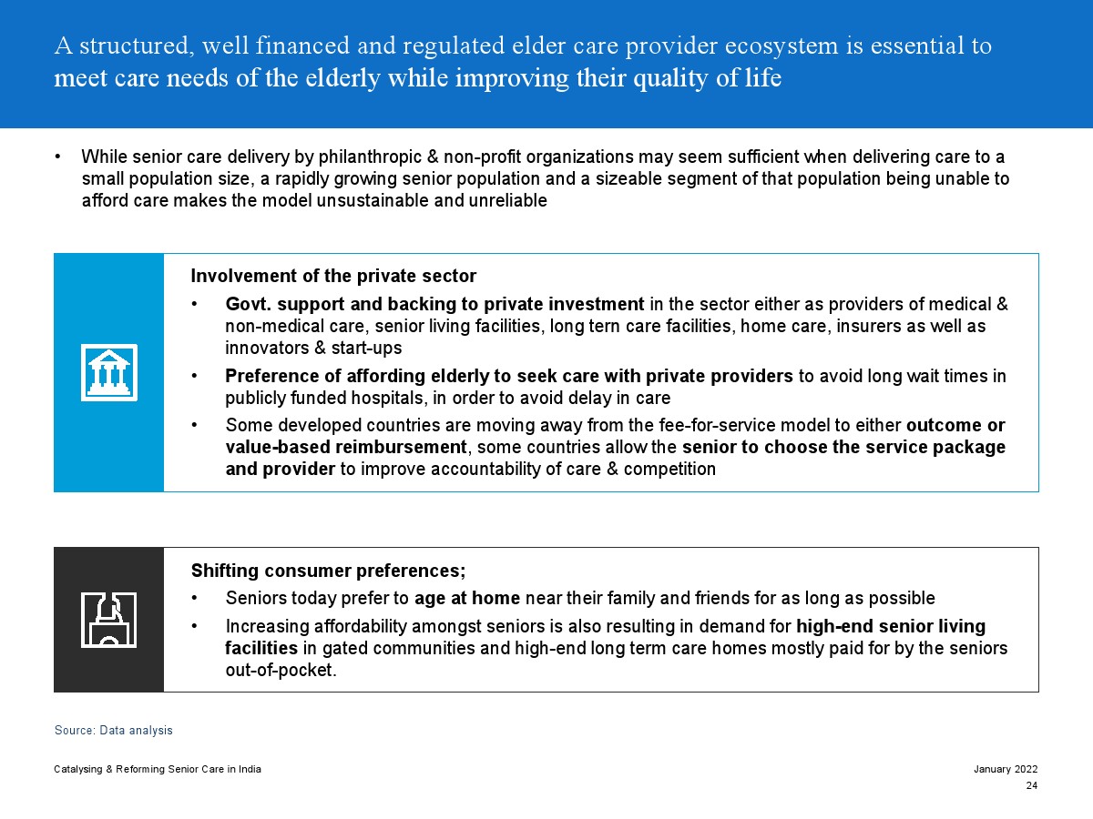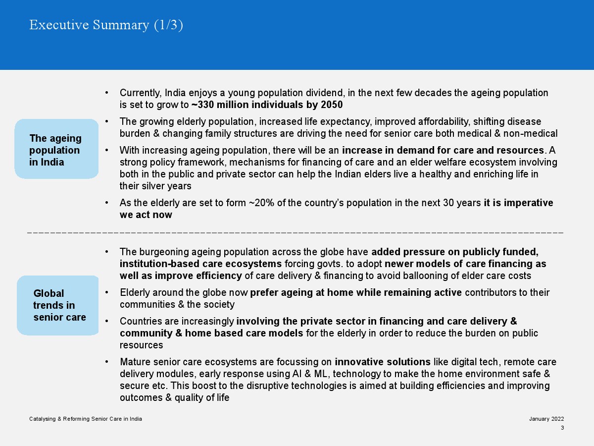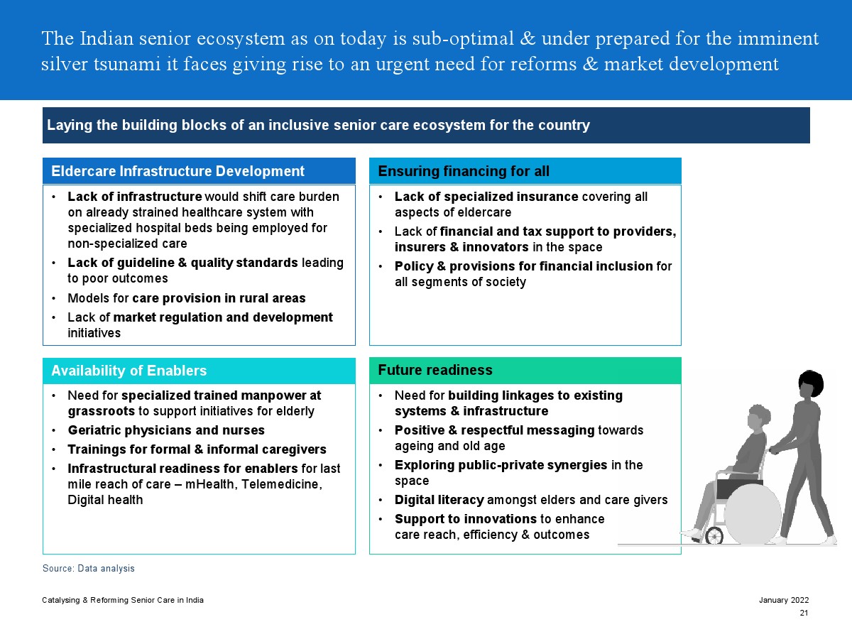 印度老年人協(xié)會發(fā)布了新報告“促進和改革印度老年人護理”。目前,印度享有年輕人口紅利。但到2050年,老齡化人口將增長到約3.3億人。老年人口的增長、預期壽命的延長、負擔能力的提高、疾病負擔的轉(zhuǎn)移和家庭結(jié)構(gòu)的變化正在推動對醫(yī)療和非醫(yī)療老年護理的需求。隨著人口老齡化的加劇,對護理和資源的需求將會增加。由于老年人將在未來30年內(nèi)占該國人口的20%,因此印度必須立即采取行動。